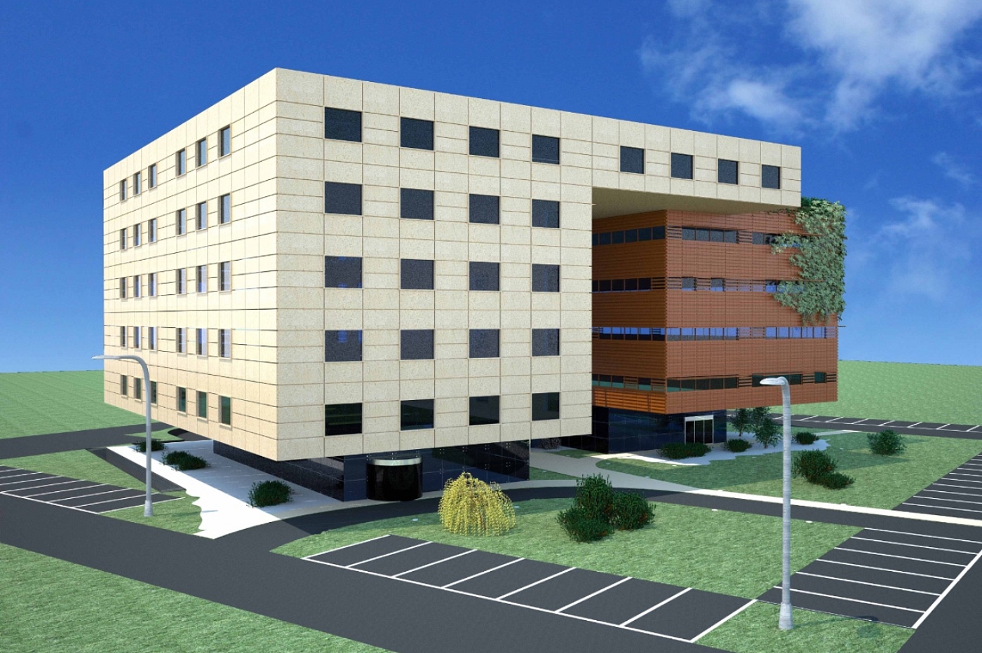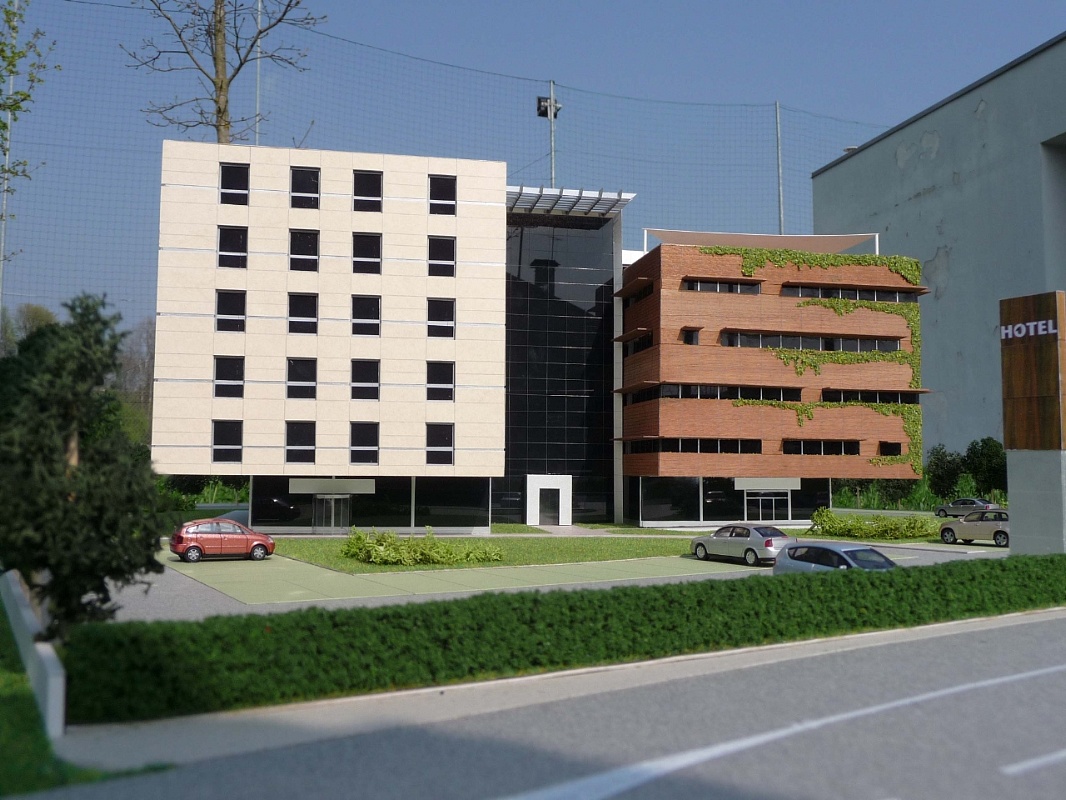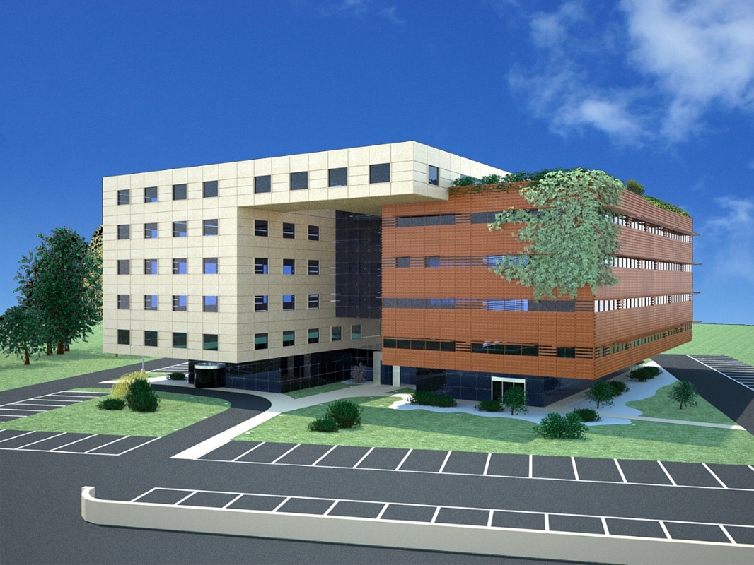 Il progetto prevede 31.500 mc fuori terra e 16.000 mc interrati. L’area adibita al nuovo centro direzionale e alberghiero prevede anche l’inserimento di alcuni servizi in comune: palestra-fitness, sale congressi, ristorazione-bar e un negozio al piano terra. Una scelta progettuale è stata quella di differenziare i volumi che identificano le due funzioni principali separando gli ingressi. Un’altra scelta è stata quella di sospendere l’edificio con la creazione di un primo piano a sbalzo, conferendo ai volumi un aspetto di leggerezza e aumentando il verde al piano terra. L’edificio è stato pensato per utilizzare con intelligenza le risorse energetiche e diminuire gli sprechi mediante una facciata ventilata e schermata da brise-soleil e da piantumazione rampicante e con una dotazione impiantistica con sistemi a recupero di calore, pannelli solari e pannelli fotovoltaici. Si è pensato per la ristorazione a un grande giardino pensile in copertura.