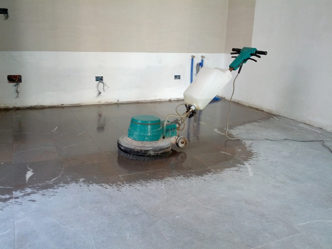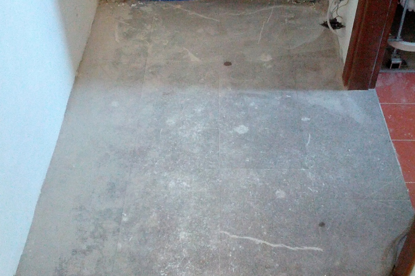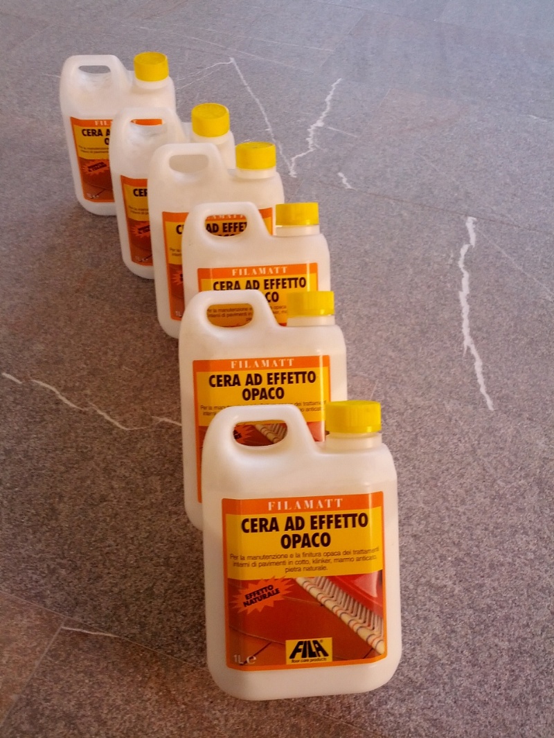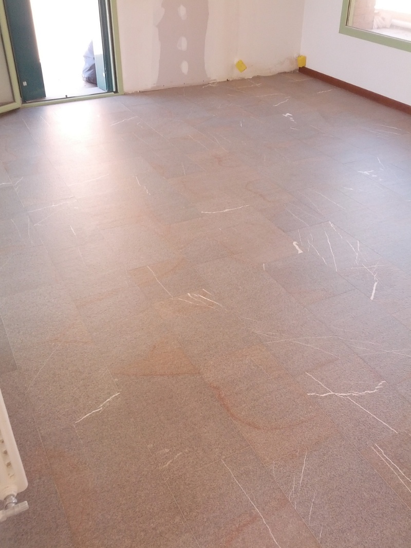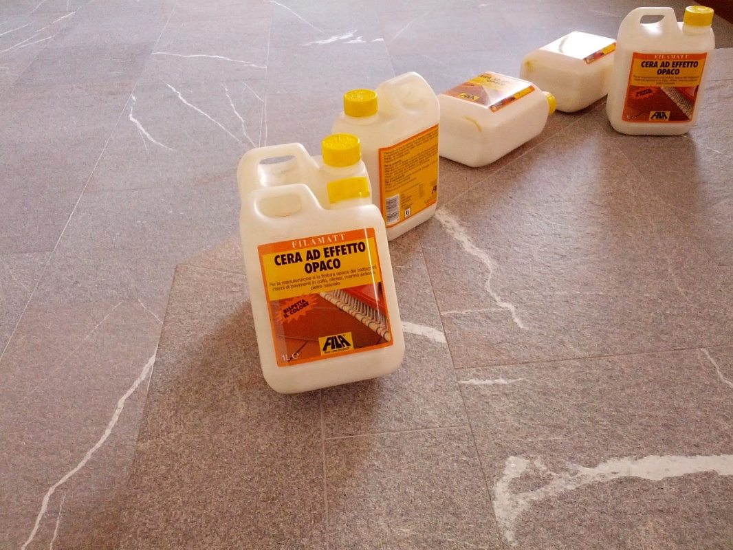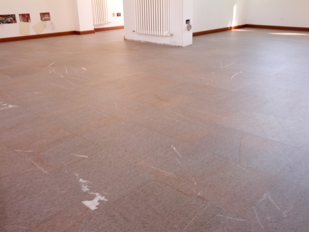 Per ottenere la perfetta pulizia in caso di pavimentazione particolarmente incrostata di cemento ( come era questa ), bisogna ricorrere ,durante il lavaggio, ad una soluzione moderatamente acida che aiuti a sciogliere il cemento.Una volta terminata la pulizia,per conferire una buona tenuta alle macchie di unto, abbiamo applicato un protettivo idrooleorepellente incolore.Quindi,per consentire una buona scorrevolezza del panno per la manutenzione,abbiamo applicato 2 mani di cera opaca.