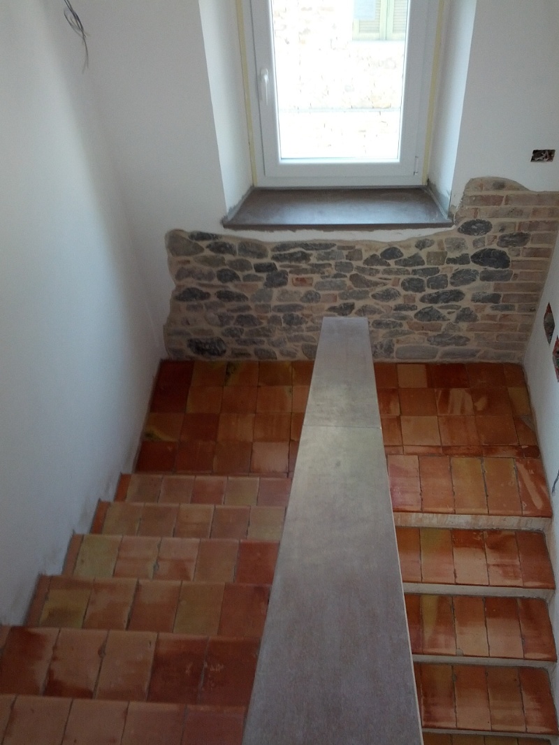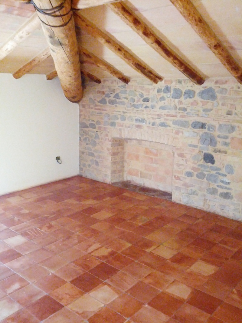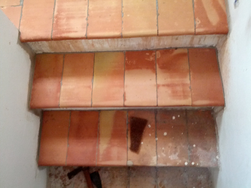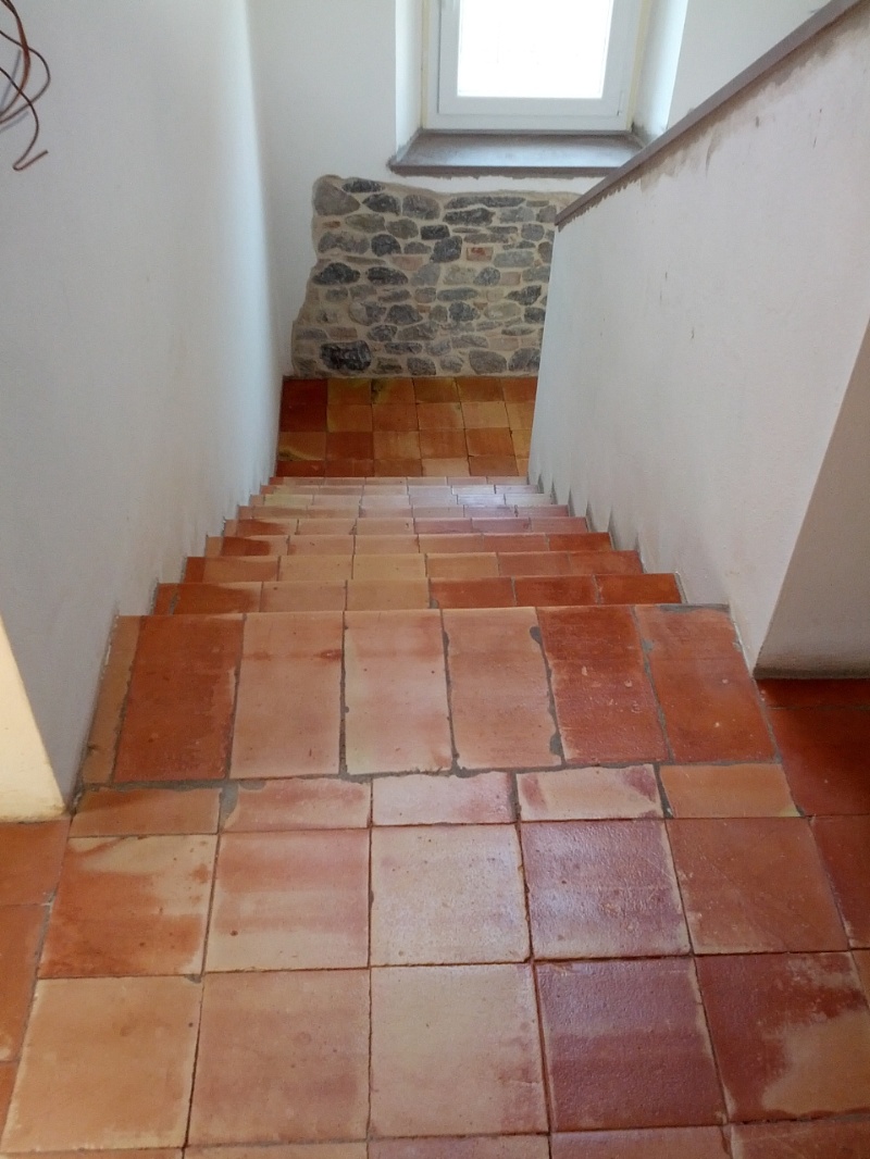 Per mettere in risalto questo meraviglioso manufatto ( Fornace Gandolfi - PR ), è stato necessario rimuovere tutti i residui di posa e anche qualche residuo di vecchie cere rosse. A questo punto è bastato esaltare la superficie con un prodotto protettivo a base di cera d'api e cera carnauba dura brasiliana.Da notare gli incredibili colori dati dalla pasta più interna gialla e dalla crosta,rossa.
