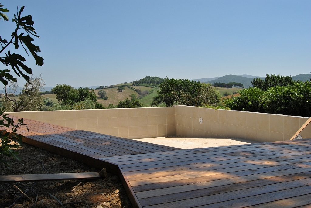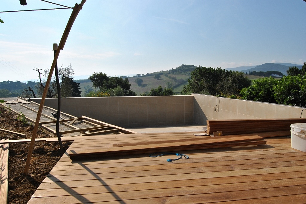 Posa di listoni in essenza Teak per bordo piscina.Montaggio su magatelli flottanti con clip a scomparsa nello stesso colore del legno.
