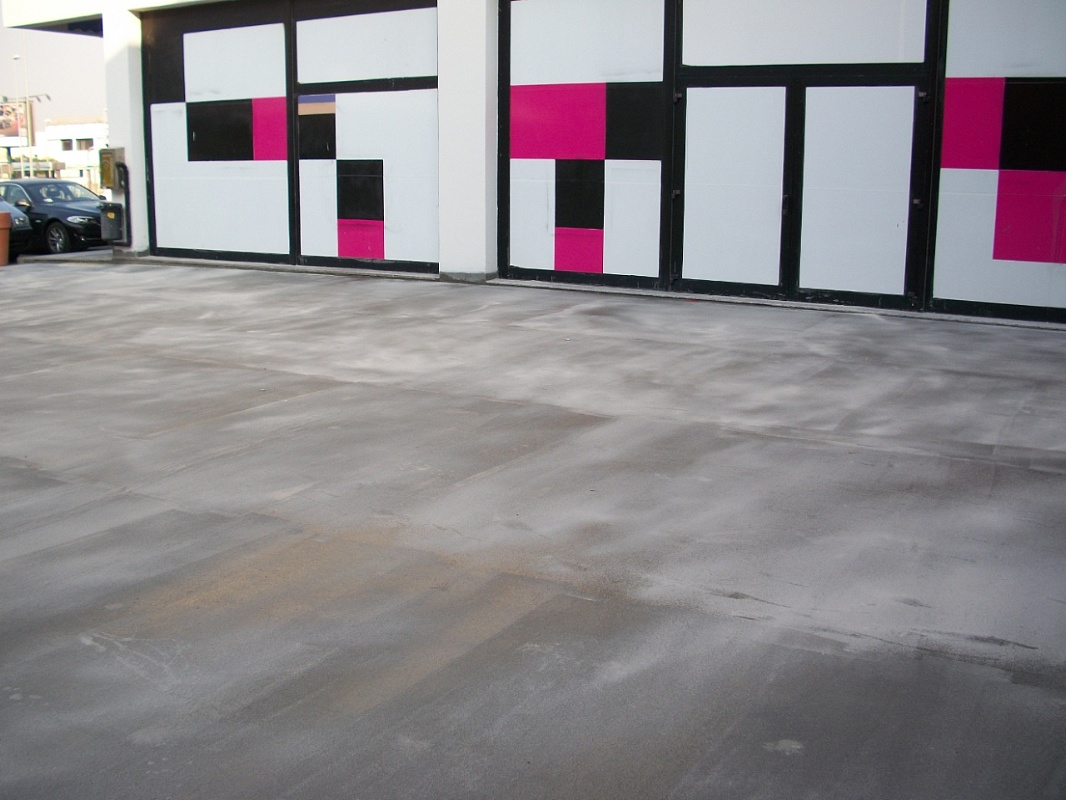 Impermeabilizzazione piazzale centro commerciale eseguito con Poliurea carrabile e finitura con resina poliuretanica colorata-