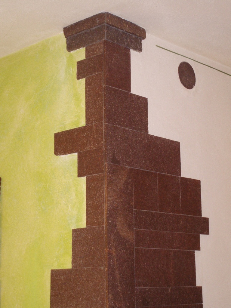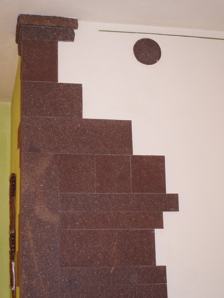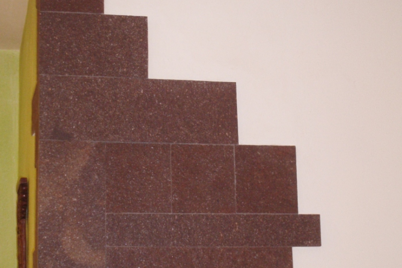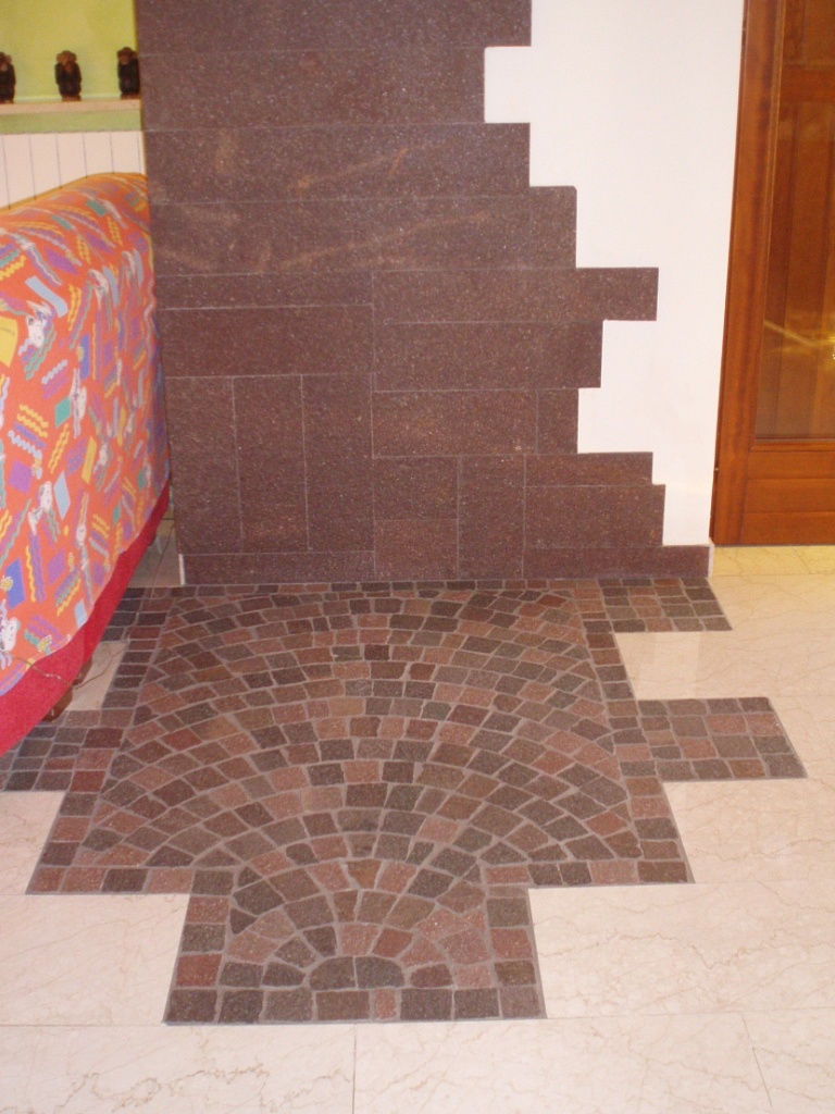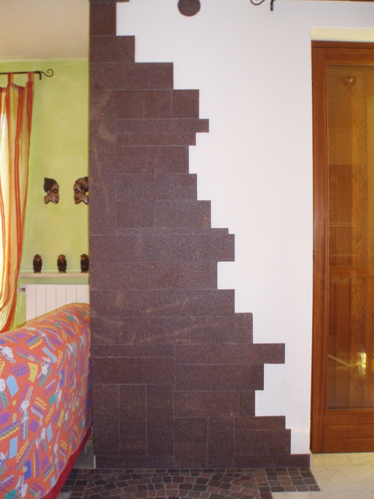 Angolo parete interna rivestita con zoccolino in porfido fiammato color bordò
