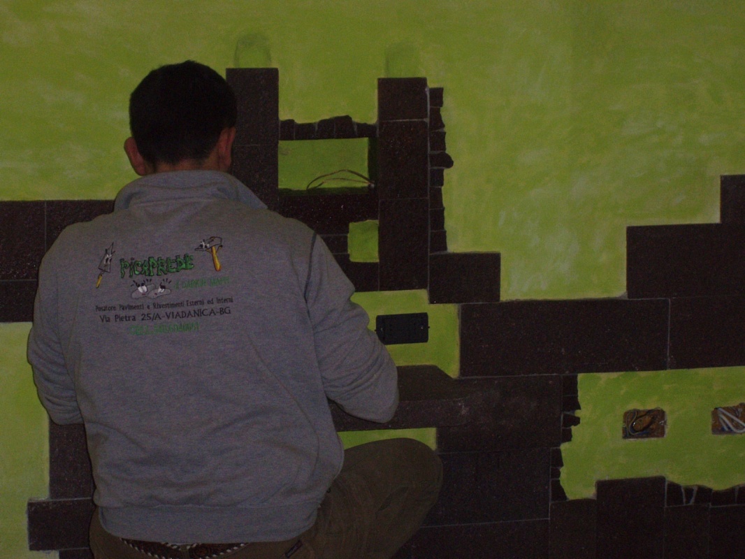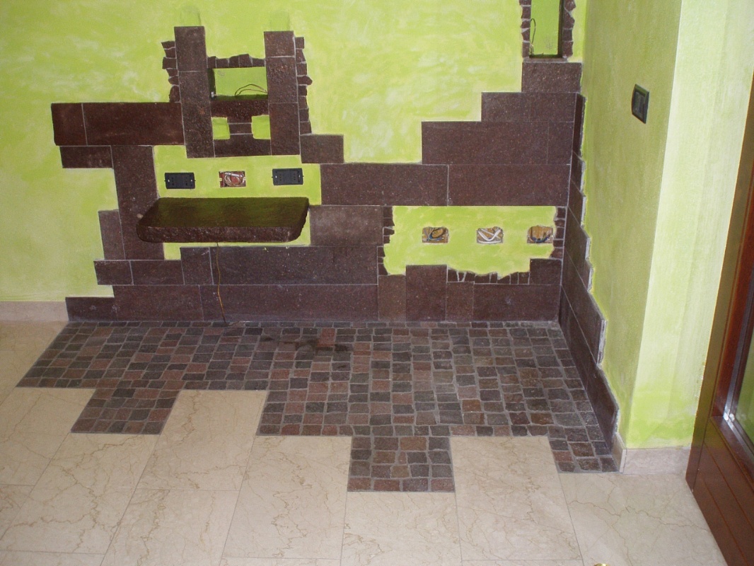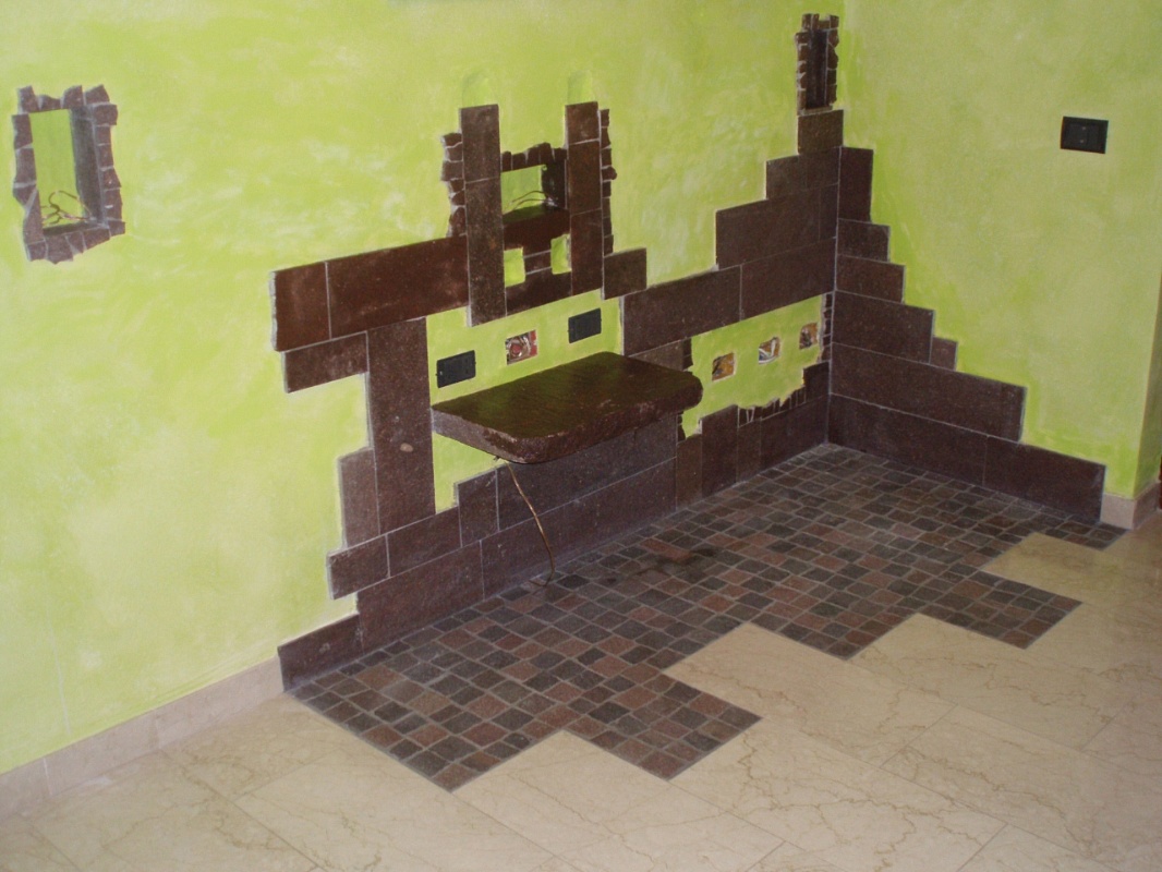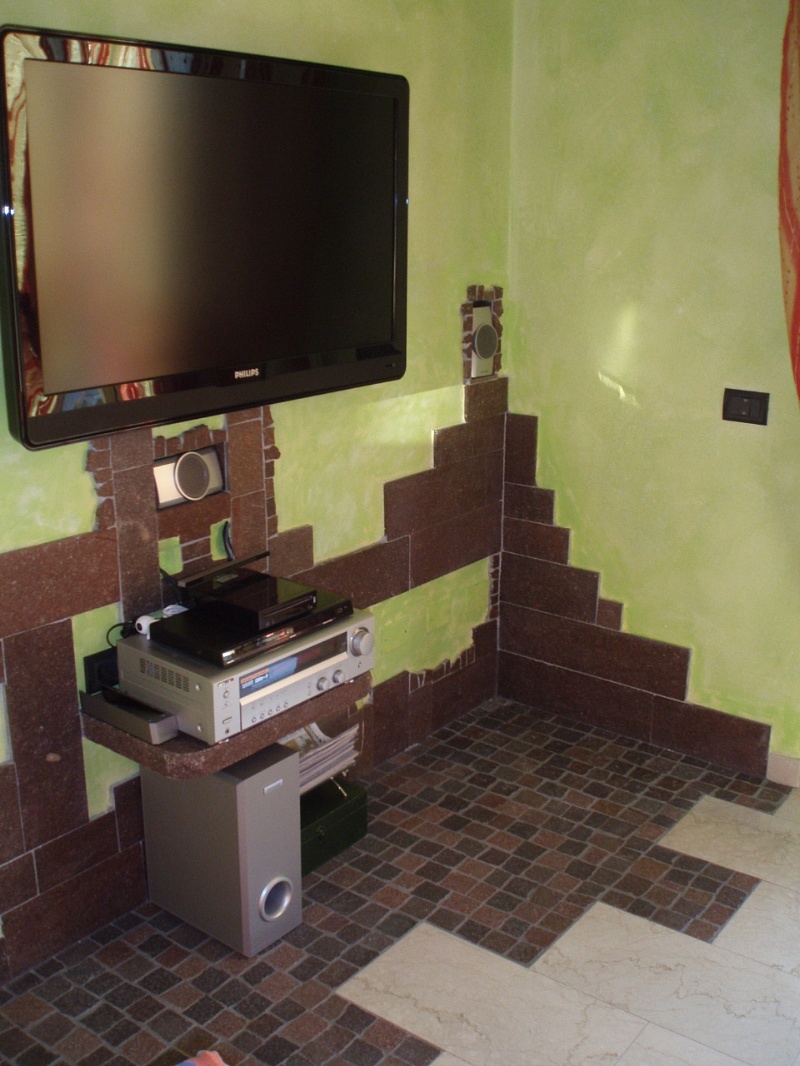 Parete interna, angolo TV, rivestita in zoccolino di porfido fiammato color bordò, con rifiniture in mosaico di spaccatello in porfido fiammato, con mensola porta dolbi in porfido, pezzo intero...pavimento in cubetti 4/6 in porfido fiammato colori misti, e piastrelle in marmo di botticino