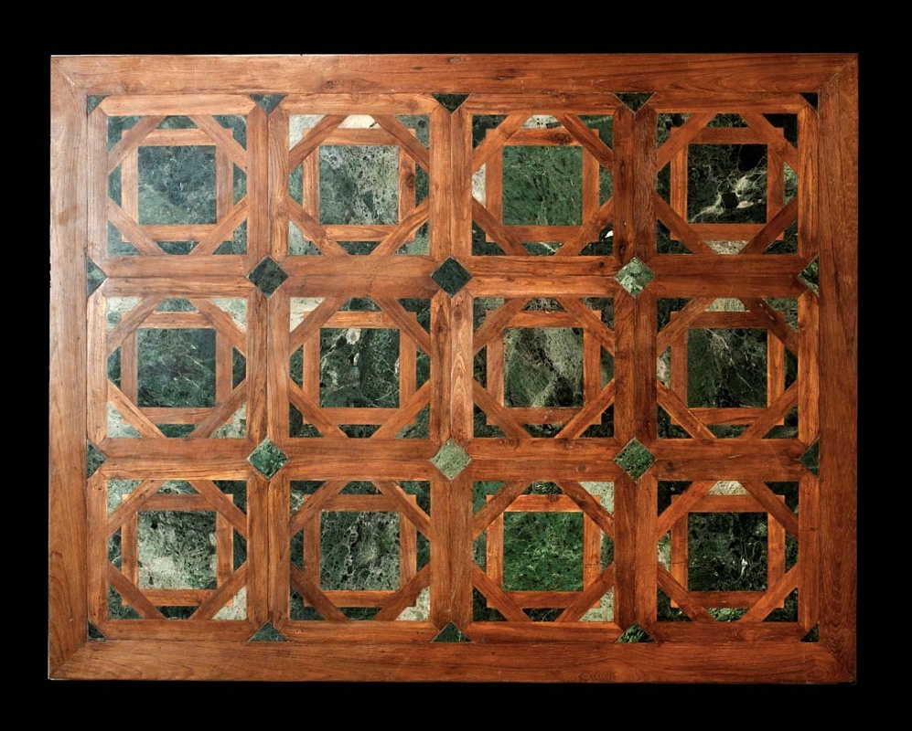 Pavimento realizzato con teak antico e marmo verde, fissate su supporto in marmo. Su richiesta si possono utilizzare marmi di diversi colori.