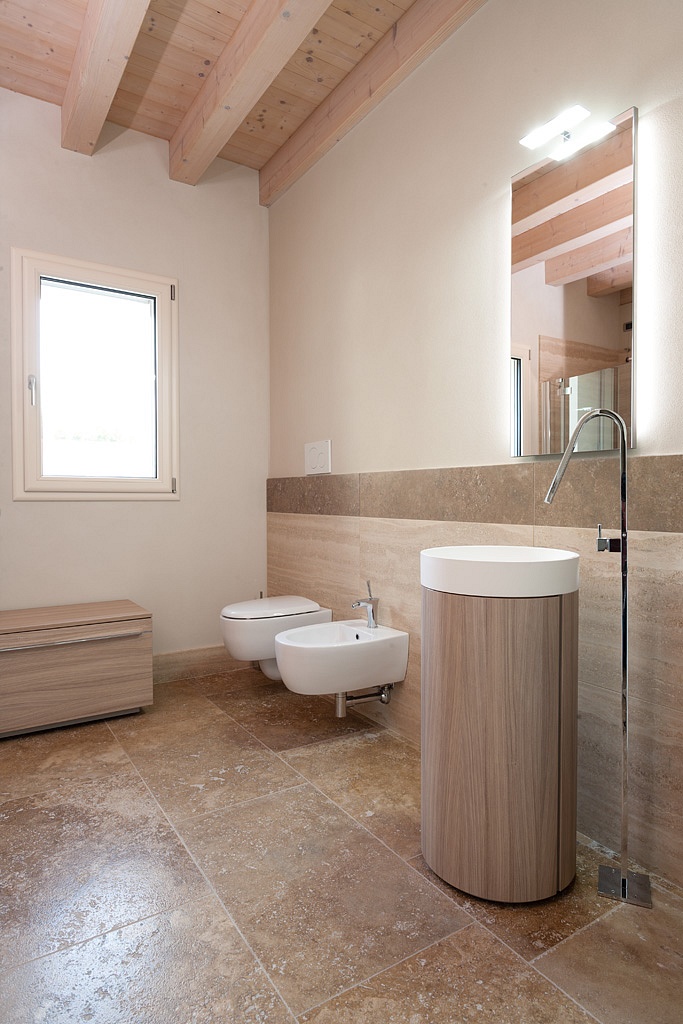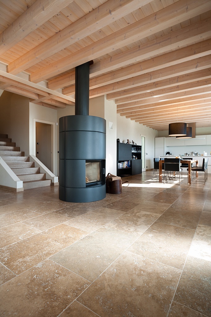 All'interno il Travertino corre dalle sale ai bagni, passando anche per il garage, in un collegamento caldo e continuo su tutto il piano terra.