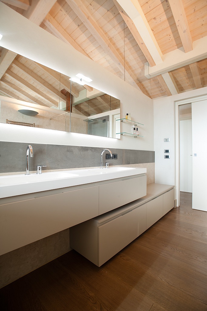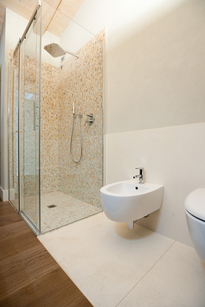 Al secondo piano incontriamo il legno e i bagni che caratterizzati da elementi in pietra e mosaico.