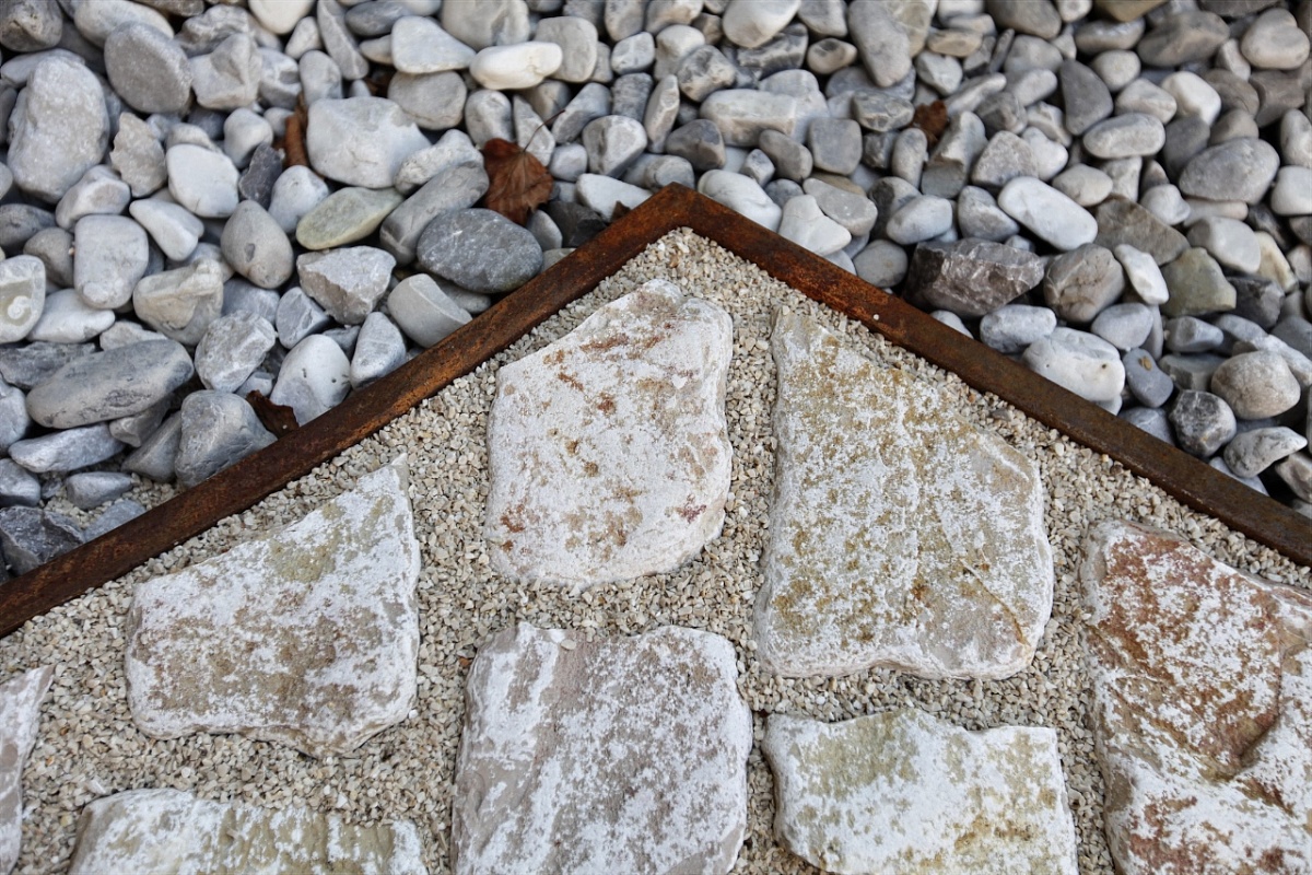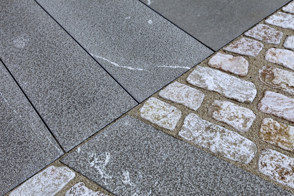 Un lavoro di accostamento di linee moderne a pavimento antico, che crea un affiancamento di impatto e di valorizzazione del castello in rosso